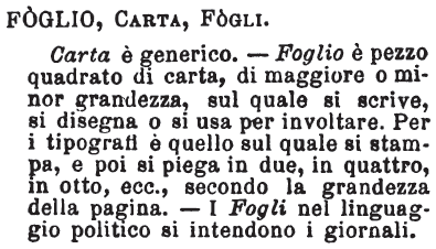 | Foglio, Carta, Fogli - Carta è generico. - Foglio è pezzo quadrato di carta, di maggiore o minor grandezza, sul quale si scrive, si disegna o si usa per involtare. Per i tipografi è quello sul quale si stampa, e poi si piega in due, in quattro, in otto, ecc., secondo la grandezza della pagina. - I Fogli nel linguaggio politico si intendono i giornali. [immagine] |