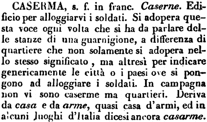 | Caserma - S. f. (Mil.) Edifizio per alloggiarvi i soldati. Deriva, dice il Grassi, da Casa e da Arme; quasi Casa d'armi. O, perchè il fr. ha Caserne, dalla desin. lat. gen. Caverna, Internus, e sim. Stor. Cong. Mess. (M.) Niente però recò maggior stupore agli Spagnuoli di alcuni cortili, o caserme, dove andavano accatastando i cadaveri della gente, che moriva in battaglia. – È anche nel Magal. |