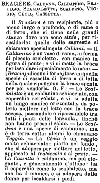 | Braciere, Caldano, Caldanino, Braciajo, Scaldaletto, Scaldino, Veggio, Cecia, Cassetta - Il Braciere è un recipiente, più o meno largo e profondo, o di rame o di ferro, che si tiene nelle grandi stanze dove non sono stufe, per riscaldarle: quelle delle sagrestie si chiamano specialmente Caldani. - Il Caldanino è un vaso di rame, in forma di piccolo orcioletto, con manico in figura di ponte; e vi si mette la brace per iscaldarsi specialmente le mani. - [Braciajo dicono i fornaj toscani quella specie di cassetta di ferro o di latta nella quale ripongono la brace spenta per poi venderla. G. F.] - Lo Scadaletto è un caldanino schiacciato, con coperchio reticolato, e vi si adatta un lungo manico orizzontale, da poterlo mettere nel letto con la brace accesa, passandolo e ripassandolo tra tutti i punti delle lenzuola, finchè non hanno preso il caldo. - Lo Scaldino è una specie di caldanino, ma è di terra cotta: alcuni lo chiamano Veggio. - La Cècia è un veggio molto schiacciato; piatto nel fondo, che si adopera per mettere nel letto, appiccato al trabiccolo o al prete. - La Cassetta è caldanino, ma più elegante, e generalmente d'ottone: ha il coperchio come lo scaldaletto, ma non ha il manico, e si adopera dalle donne per iscaldarsi i piedi. [immagine] |