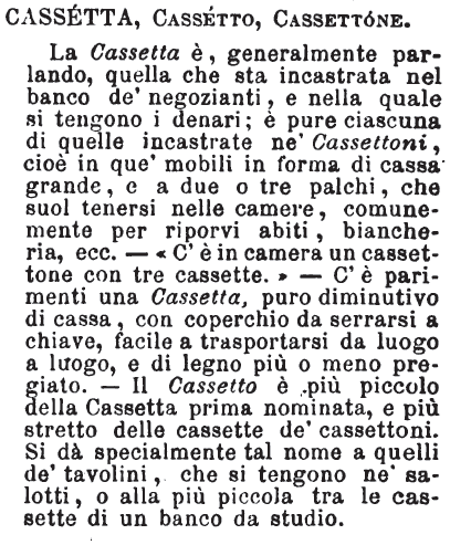 | Cassetta, Cassetto, Cassettone - La Cassetta è, generalmente parlando, quella che sta incastrata nel banco de’ negozianti, e nella quale si tengono i denari; è pure ciascuna di quelle incastrate ne’ Cassettoni, cioè in que’ mobili in forma di cassa grande, e a due o tre palchi, che suol tenersi nelle camere, comunemente per riporvi abiti, biancheria, ecc. - «C’è in camera un cassettone con tre cassette.» - C’è parimenti una Cassetta, puro diminutivo di cassa, con coperchio da serrarsi a chiave, facile a trasportarsi da luogo a luogo, e di legno più o meno pregiato. – Il Cassetto è più piccolo della Cassetta prima nominata, e più stretto delle cassette de’ cassettoni. Si dà specialmente tal nome a quelli de’ tavolini, che si tengono ne’ salotti, o alla più piccola tra le cassette di un banco da studio. [immagine] |