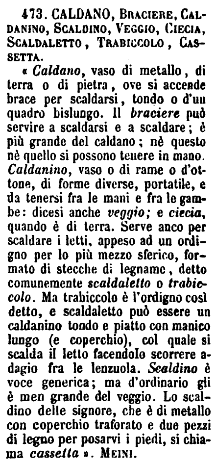 | Caldano, Braciere, Caldanino, Scaldino, Veggio, Ciecia, Scaldaletto, Trabiccolo, Cassetta - «Caldano, vaso di metallo, di terra o di pietra, ove si accende brace per scaldarsi, tondo o d'un quadro bislungo. Il braciere può servire a scaldarsi e a scaldare; è più grande del caldano; nè questo nè quello si possono tenere in mano. Caldanino, vaso o di rame o d'ottone, di forme diverse, portatile, e da tenersi fra le mani e fra le gambe: dicesi anche veggio; e ciecia, quando è di terra. Serve anco per scaldare i letti, appeso ad un ordigno per lo più mezzo sferico, formato di stecche di legname, detto comunemente scaldaletto o trabiccolo. Ma trabiccolo è l'ordigno così detto, e scaldaletto può essere un caldanino tondo e piatto con manico lungo (e coperchio), col quale si scalda il letto facendolo scorrere adagio fra le lenzuola. Scaldino è voce generica; ma d'ordinario gli è men grande del veggio. Lo scaldino delle signore, che è di metallo con coperchio traforato e due pezzi di legno per posarvi i piedi, si chiama cassetta». Meini. [immagine] |