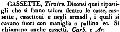 | Cassette - Tiroirs. Diconsi quei ripostigli che si fanno talora dentro le casse, cassette, cassettoni e negli armadi, i quali si cavano fuori con maniglia o pallino ec. Si chiamano anche cassetti. Carb. e Ar. [immagine] |