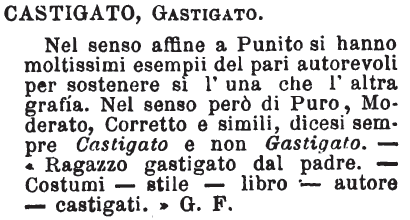 | Castigato, Gastigato - Nel senso affine a Punito si hanno moltissimi esempii del pari autorevoli per sostenere si l'una che l'altra grafia. Nel senso però di Puro, Moderato, Corretto e simili, dicesi sempre Castigato e non Gastigato. - « Ragazzo gastigato dal padre. - Costumi - stile- libro - autore - castigati. » G. F. [immagine] |