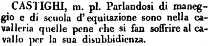 | Castighi - m. pl. Parlandosi di maneggio e di scuola d'equitazione sono nella cavalleria quelle pene che si fan soffrire al cavallo per la sua disubbidienza. [immagine] |