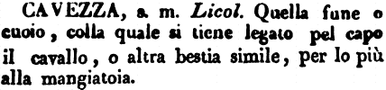 | Cavezza - s. m. Licol. Quella fune o cuio, colla quale si tiene legato pel capo il cavallo, o altra bestia simile, per lo più alla mangiatoia. [immagine] |