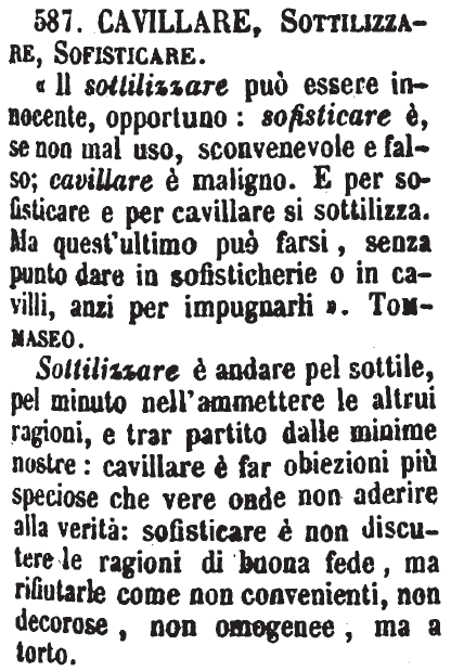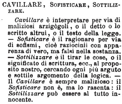 Cavillare, Sottilizzare, Sofisticare - «Il sottilizzare può essere innocente, opportuno: sofisticare è, se non mal uso, sconvenevole e falso; cavillare è maligno. E per sofisticare e per cavillare si sottilizza. Ma quest'ultimo può farsi, senza punto dare in sofisticherie o in cavilli, anzi per impugnarli». Tommaseo.