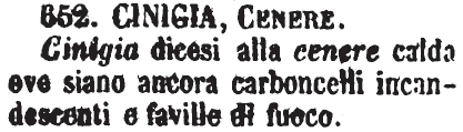 | Cinigia, Cenere - Cinigia dicesi alla cenere calda ove siano ancora carboncelli incandescenti e faville di fuoco. [immagine] |