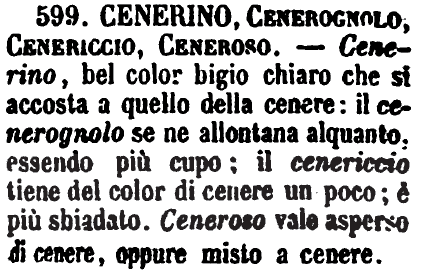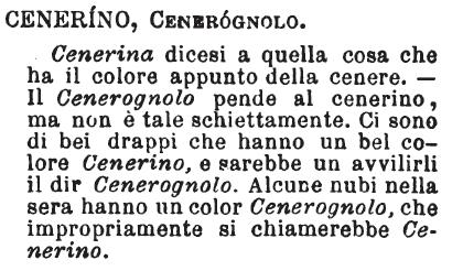 Cenerino, Cenerognolo, Cenericcio, Ceneroso - Cenerino, bel color bigio chiaro che si accosta a quello cenere: il cenerognolo se ne allontana alquanto, essendo più cupo; il cenericcio tiene del color di cenere un poco; è più sbiadato. Ceneroso vale asperso di cenere, oppure misto a cenere. [immagine]