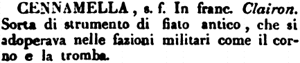| Cennamella - s. f. In franc. Clairon. Sorta di strumento di fiato antico, che si adoperava nelle fazioni militari come il corno e la tromba. [immagine] |