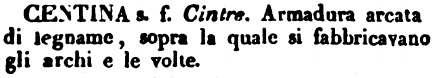 Centina - s. f. Cintre. Armadura arcata di legname, sopra la quale si fabbricavano gli archi e le volte. [immagine]