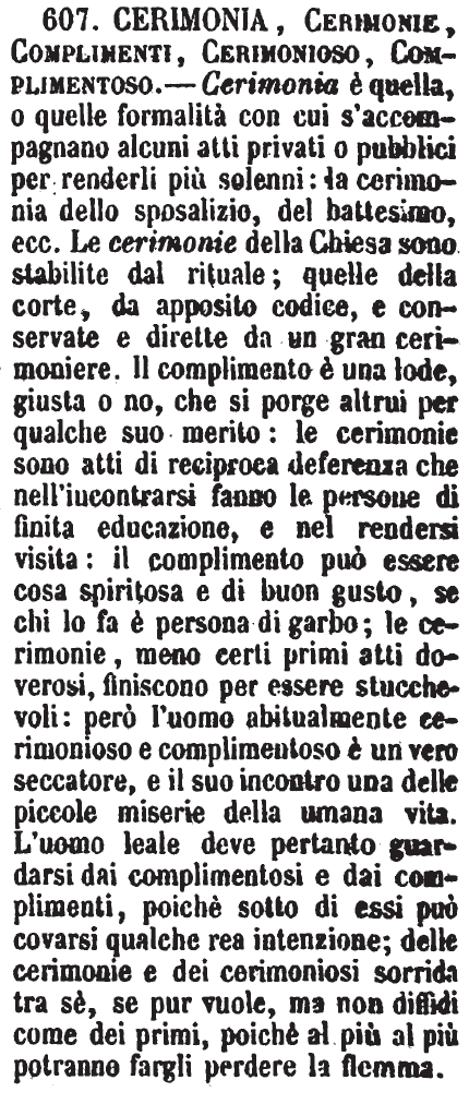 | Cerimonia, Complimenti, Convenevoli - Le Cerimonie sono gli atti di debita riverenza, che si fanno in certi casi verso certe persone, conforme prescrive una regola o una consuetudine. - I Complimenti sono uffici di riverenza e d'affetto, che si fanno tra persone educate, massimamente quando o si augura loro felicità, o temiamo di dar loro incomodo, o simili. - I Convenevoli sono atti di riverenza e d'affetto, non fatti come i complimenti, per pura cortesia, ma dicevoli e convenienti a farsi in certi casi a certe persone. [immagine] |