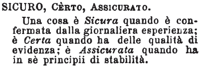 | Sicuro, Certo, Assicurato - Una cosa è Sicura quando è confermata dalla giornaliera esperienza; è Certa quando ha delle qualità di evidenza; è Assicurata quando ha in sè principii di stabilità. [immagine] |