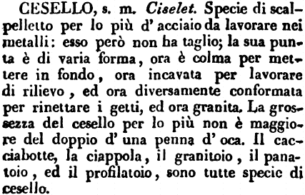 Cesello - S. m. (B.A.) [Manf.] Strumento da cesellare, fatto per lo più a guisa di scarpelletto, benchè ve n'abbia di più forme, generalmente d'acciajo, ma senza taglio, e talora di legno duro, dovendo servire per piegare la piastra, non per tagliarla. T. Da Caedo. – Cilio, onis, in Isid. [Manf.] Baldin. Voc. Dis. I ceselli sono di varie sorte, cioè grossi, mezzani, e piccoli, i quali cominciando da una tal grossezza vanno sempre scemando, riducendosi in fondo a diverse grossezze, larghezze e forme: per lo più sono d'altezza d'un dito e di grossezza d'una penna d'oca, e vanno ingrossando pel doppio. Alcuni hanno in fondo la forma della lettera C, cominciando da un piccolo fino ad un grande, alcuni più, alcuni meno volti, sinchè si viene a quelli, che sono diritti appunto.