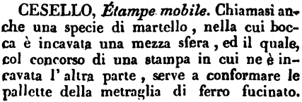 Cesello - Étampe mobile. Chiamasi anche una specie di martello, nella cui bocca è incavata una mezza sfera, ed il quale, col concorso di una stampa in cui ne è incavata l'altra parte, serve a conformare le pallette della metraglia di ferro fucinato. [immagine]