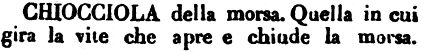 | Chiocciola - s. f. Ècrou. Pezzo di metallo o legno con un foro in mezzo fatto a spira, nel quale entra e gira il maschio che si chiama vite.