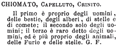 | Chiomato, Capelluto, Crinito - Il primo è proprio degli uomini, delle bestie, degli alberi, di stelle e di comete; il secondo solo degli uomini; il terzo è raro detto degli uomini, ed è più proprio degli animali, delle Furie e delle stelle. G. F. [immagine] |
