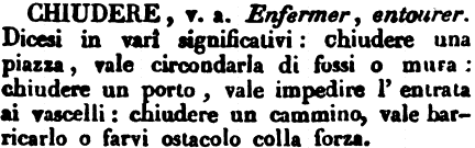 Chiudere - v. a. Enfermer, entourer. Dicesi in vari significativi: chiudere una piazza, vale circondarla di fossi o mura: chiudere un porto, vale impedire l'entrata ai vascelli: chiudere un cammino, vale barricarlo o farvi ostacolo colla forza. [immagine]