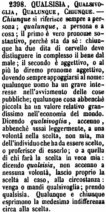 | Chiunque, Chicchessia, Qualunque, Qualsivoglia - Chiunque e Chicchessia si dicono solo di persone: il primo ha bisogno di un compimento, volendo essere esatti; onde io non sarò esatto se, per esempio, scriverò: «Queste cose chiunque le vede;» ma dovrò dire: «Chiunque ha senno, Chiunque ci pone mente, o simili.» - Se però usasi Chicchessia, allora può porsi così scusso, perchè ha il suo compimento in quel sia. - Le voci Qualunque e Qualsivoglia sono, dirò così, adiettive, e hanno sempre bisogno di essere accompagnate dal loro sostantivo, come qualunque cosa, qualunque persona. [immagine] |