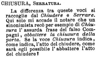 Chiusura, Serratura - La differenza tra queste voci si raccoglie dal Chiudere e Serrare. Qui solo mi accade il notare che un sinonimista recò per esempio di Chiusura l'assurda frase del falso Compagni, abbattere la chiusura della porta. Se la voce Chiusura indica, come indica, l'atto del chiudere, come sarà egli possibile l'abbattere l'atto del chiudere? [immagine]