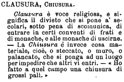 Clausura, Chiusura - Clausura è voce religiosa, e significa il divieto che si pone a' secolari, sotto pena di scomunica, di entrare in certi conventi di frati e di monache, e alle monache di uscirne. - La Chiusura è invece una cosa materiale, cioè, o steccato, o muro, o palancato, che si ponga ad un luogo per impedire che altri vi entri. - «Ho fatto a quel campo una chiusura di grossi pali.» [immagine]