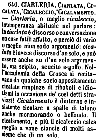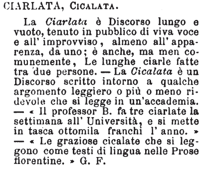 | Ciarlata, Cicalata - La Ciarlata è Discorso lungo e vuoto, tenuto in pubblico di viva voce e all'improvviso, almeno all'apparenza, da uno; è anche, ma men comunemente, Le lunghe ciarle fatte tra due persone. - La Cicalata è un Discorso scritto intorno a qualche argomento leggiero o più o meno ridevole che si legge in un'accademia. - «Il professor B. fa tre ciarlate la settimana all'Università, e si mette in tasca ottomila franchi l'anno.» - «Le graziose cicalate che si leggono come testi di lingua nelle Prose fiorentine.» G. F. [immagine] |