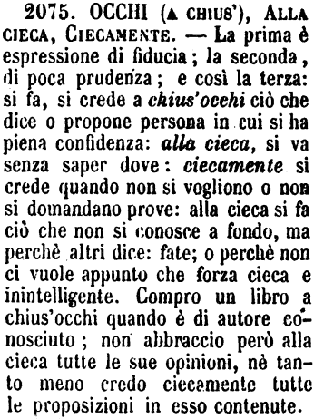 | Occhi (a chius'), Alla cieca, Ciecamente - La prima è espressione di fiducia; la seconda, di poca prudenza; e così la terza: si fa, si crede a chius'occhi ciò che dice o propone persona in cui si ha piena confidenza: alla cieca, si va senza saper dove: ciecamente si crede quando non si vogliono o non si domandano prove: alla cieca si fa ciò che non si conosce a fondo, ma perchè altri dice: fate; o perchè non ci vuole appunto che forza cieca e inintelligente. Compro un libro a chius'occhi quando è di autore conosciuto; non abbraccio però alla cieca tutte le sue opinioni, nè tanto meno credo ciecamente tutte le proposizioni in esso contenute. [immagine] |