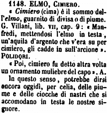| Elmo, Cimiero - «Cimiero (cima) è il sommo dell'elmo, guarnito di divisa o di piume. G. Villani, lib. VII, cap. 9: «Manfredi, mettendosi l'elmo in testa, un'aquila d'argento che v'era su per cimiero, gli cadde in sull'arcione». Polidori.