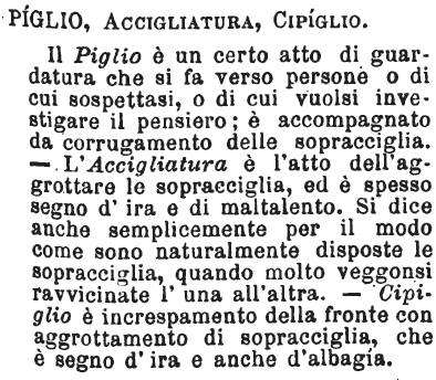 Piglio, Accigliatura, Cipiglio - Il Piglio è un certo atto di guardatura che si fa verso persone o di cui sospettasi, o di cui vuolsi investigare il pensiero; è accompagnato da corrugamento delle sopracciglia. - L'Accigliatura è l'atto dell'aggrottare le sopracciglia, ed è spesso segno d'ira e di maltalento. Si dice anche semplicemente per il modo come sono naturalmente disposte le sopracciglia, quando molto veggonsi ravvicinate l'una all'altra. - Cipiglio è increspamento della fronte con aggrottamento di sopracciglia, che è segno d'ira e anche d'albagia. [immagine]