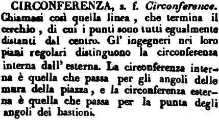 | Circonferenza - s. f. Circonference. Chiamasi così quella linea, che termina il cerchio, di cui i punti sono tutti egualmente distanti dal centro. Gl'ingegneri nei loro piani regolari distinguono la circonferenza interna dall'esterna. La circonferenza interna è quella che passa per gli angoli delle mura della piazza, e la circonferenza esterna è quella che passa per la punta degli angoli dei bastioni. [immagine] |