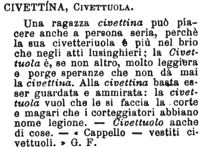 | Civettina, Civettuola - Una ragazza civettina può piacere anche a persona seria, perchè la sua civetteriuola è più nel brio che negli atti lusinghieri; la Civettuola è, se non altro, molto leggiera e porge speranze che non dà mai la civettina. Alla civettina basta esser guardata e ammirata: la civettuola vuol che le si faccia la corte e magari che i corteggiatori abbiano nome legione. - Civettuolo anche di cose. - « Cappello - vestiti civettuoli. » G. F. [immagine] |