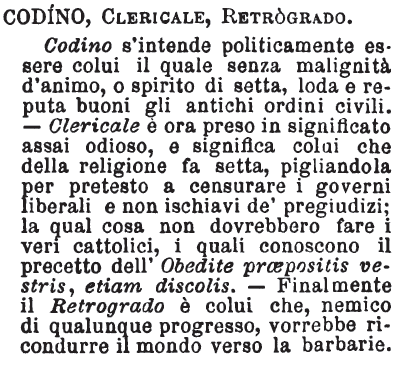 | Codino, Clericale, Retrogrado - Codino s'intende politicamente essere colui il quale senza malignità d'animo, o spirito di setta, loda e reputa buoni gli antichi ordini civili. - Clericale è ora preso in significato assai odioso, e significa colui che della religione fa setta, pigliandola per pretesto a censurare i governi liberali e non ischiavi de' pregiudizi; la qual cosa non dovrebbero fare i veri cattolici, i quali conoscono il precetto dell'Obedite praepositis vestris, etiam discolis. - Finalmente il Retrogrado è colui che, nemico di qualunque progresso, vorrebbe ricondurre il mondo verso la barbarie. [immagine] |