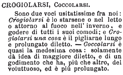 | Crogiolarsi, Coccolarsi - Sono due voci usitatissime fra noi: Crogiolarsi è lo starsene o nel letto o attorno al fuoco nell'inverno, e godere di tutti i suoi comodi; e Crogiolarsi una cosa è il pigliarne lungo e prolungato diletto. - Coccolarsi è quasi la medesima cosa: solamente dà idea di maggiore diletto, e di un godimento che ha, più che altro, del voluttuoso, ed è più prolungato. [immagine] |