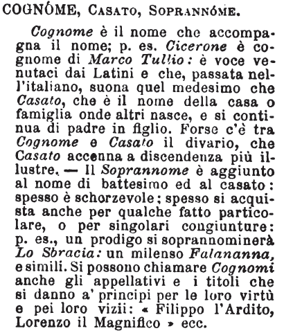| Nome, Cognome, Casato, Soprannome - Nome è quello che si pone all'atto del battesimo. - Il Cognome è quello che già si prese la famiglia, e che non si muta; e se parlasi di gente di buona condizione, si chiama Casato. - Alle volte, o per un fatto speciale, o per certe particolarità, si dà altrui un appellativo che le ricordi, e che si sostituisce al nome, e quello è il Soprannome. [immagine] |