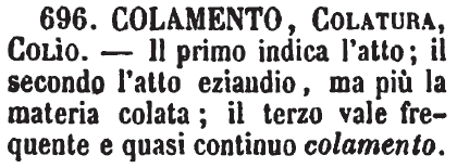 | Colamento, Colatura, Colio - Il primo indica l'atto; il secondo l'atto eziandio, ma più la materia colata; il terzo vale frequente e quasi continuo colamento. [immagine] |