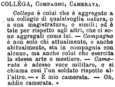 | Collega, Compagno, Camerata - Collega è colui che è aggregato a un collegio di qualsivoglia natura, o a una magistratura, o simili; ed è tale per rispetto agli altri, che si sono aggregati come lui. - Compagno è non solo chi attualmente, e anche abitualmente, sta in compagnia con alcuno, ma anche colui che esercita la stessa arte o mestiere. - Camerata è adesso voce militare, e si chiama così l'un soldato rispetto all'altro. - «È mio camerata. - Oh, addio camerata.» [immagine] |