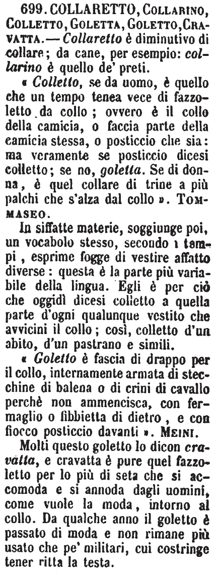 «Colletto, se da uomo, è quello che un tempo tenea vece di fazzoletto da collo; ovvero è il collo della camicia, o faccia parte della camicia stessa, o posticcio che sia: ma veramente se posticcio dicesi colletto; se no, goletta. Se di donna, è quel collare di trine a più palchi che s'alza dal collo». Tommaseo. In siffatte materie, soggiunge poi, un vocabolo stesso, secondo i tempi, esprime fogge di vestire affatto diverse: questa è la parte più variabile della lingua. Egli è per ciò che oggidì dicesi colletto a quella parte d'ogni qualunque vestito che avvicini il collo; così, colletto d'un abito, d'un pastrano e simili. «Goletto è fascia di drappo per il collo, internamente armata di stecchine di balena o di crini di cavallo perchè non ammencisca, con fermaglio o fibbietta di dietro, e con fiocco posticcio davanti». Meini. Molti questo goletto lo dicon cravatta, e cravatta è pure quel fazzoletto per lo più di seta che si accomoda e si annoda dagli uomini, come vuole la moda, intorno al collo. Da qualche anno il goletto è passato di moda e non rimane più usato che pe' militari, cui costringe tener ritta la testa. [immagine] |