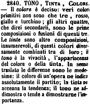 | Tono, Tinta, Colore - Il colore è deciso: veri colori primitivi non sono che tre, rosso, giallo e turchino; gli altri quattro, che direi secondarii, sono le prime composizioni o fusioni di questi tre. Le tinte sono altre composizioni, innumerevoli, di questi colori diversamente combinati tra di loro; il tono è la vivacità, l'appariscenza del colore o della tinta. In senso traslato le differenze sono le medesime: il colore di un'opera ne indica assolutamente il partito; la tinta ne accenna la tendenza; il tono ne addimostra o tende a dimostrarne l'importanza. [immagine] |