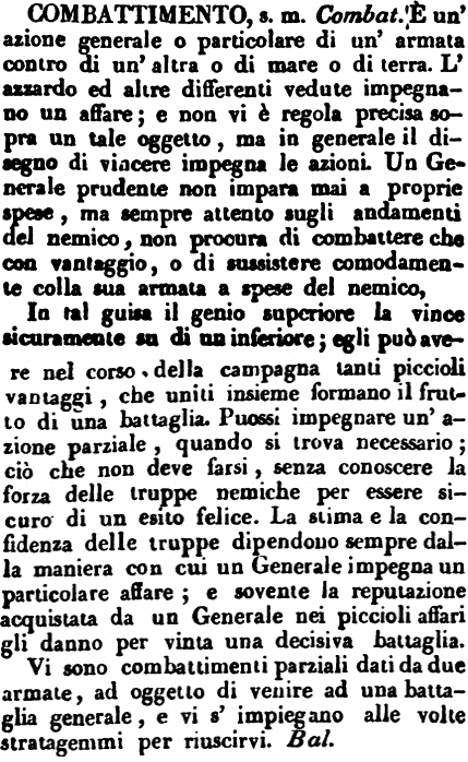 | Combattimento - s. m. Combat. È un'azione generale o particolare di un'armata contro di un'altra o di mare o di terra. L'azzardo ed altre differenti vedute impegnano un affare; e non vi è regola precisa sopra un tale oggetto, ma in generale il disegno di vincere impegna le azioni. Un Generale prudente non impara mai a proprie spese, ma sempre attento sugli andamenti del nemico, non procura di combattere che con vantaggio, o di sussistere comodamente colla sua armata a spese del nemico.