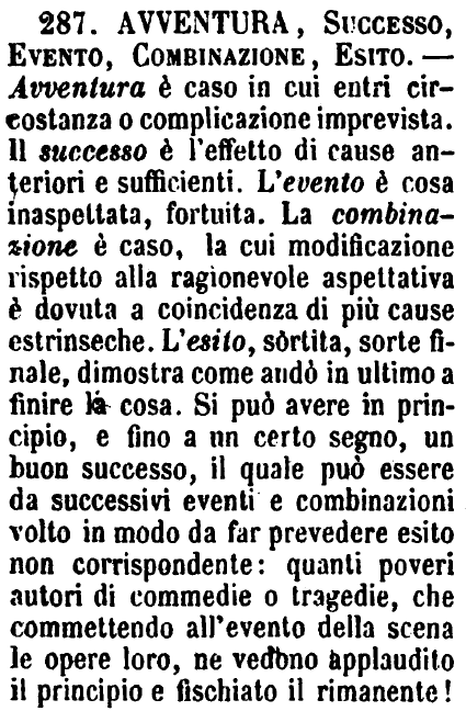 | Avventura, Successo, Evento, Combinazione, Esito - Avventura è caso in cui entri circostanza o complicazione imprevista. Il successo è l'effetto di cause anteriori e sufficienti. L' evento è cosa inaspettata, fortuita. La combinazione è caso, la cui modificazione rispetto alla ragionevole aspettativa è dovuta a coincidenza di più cause estrinseche. L'esito, sortita, sorte finale, dimostra come andò in ultimo a finire la cosa. Si può avere in principio, e fino a un certo segno, un buon successo, il quale può essere da successivi eventi e combinazioni volto in modo da far prevedere esito non corrispondente: quanti poveri autori di commedie o tragedie, che commettendo all'evento della scena le opere loro, ne vedono applaudito il principio e fischiato il rimanente! [immagine] |