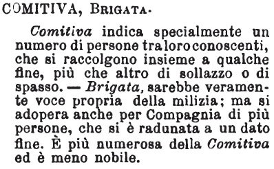 | Comitiva, Brigata - Comitiva indica specialmente un numero di persone tra loro conoscenti, che si raccolgono insieme a qualche fine, più che altro di sollazzo o di spasso. - Brigata, sarebbe veramente voce propria della milizia; ma si adopera anche per Compagnia di più persone, che si è radunata a un dato fine. E' più numerosa della Comitiva ed è meno nobile. [immagine] |