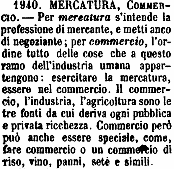 | Mercatura, Commercio - Per Mercatura s'intende la professione di mercante, e metti anco di negoziante. - Per Commercio, l'ordine tutto delle cose che a questo ramo dell'industria umana appartengono. - «Esercitare la mercatura. - Essere nel commercio.» - «Il commercio, l'industria, l'agricoltura sono le tre fonti da cui deriva ogni pubblica e privata ricchezza.» - Commercio però può anche essere speciale, come, Fare commercio o un commercio di riso, vino, panni, sete e simili. [immagine] |