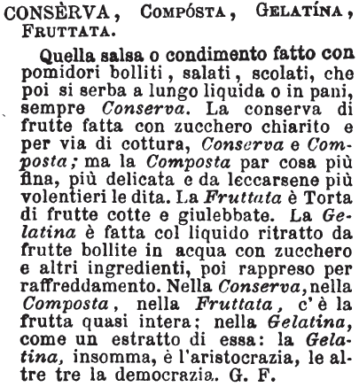| Conserva, Composta, Gelatina, Fruttata - Quella salsa o condimento fatto con pomidori bolliti, salati, scolati, che poi si serba a lungo liquida o in pani, sempre Conserva. La conserva di frutte fatta con zucchero chiarito e per via di cottura, Conserva e Composta; ma la Composta par cosa più fina, più delicata e da leccarsene più volentieri le dita. La Fruttata è Torta di frutte cotte e giulebbate. La Gelatina è fatta col liquido ritratto da frutte bollite in acqua con zucchero e altri ingredienti, poi rappreso per raffreddamento. Nella Conserva, nella Composta, nella Fruttata, c'è la frutta quasi intera; nella Gelatina, come un estratto di essa: la Gelatina, insomma, è l'aristocrazia, le altre tre la democrazia. G. F. [immagine] |