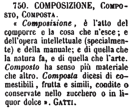 | Composizione, Composto, Composta - «Composizione, è l'atto del comporre e la cosa che n'esce; e dell'opera intellettuale (specialmente) e della manuale; e di quella che la natura fa, e di quella che l'arte. Composto ha senso più materiale che altro. Composta dicesi di comestibili, frutta e simili, condite o conservate nello zucchero o in liquor dolce». Gatti. [immagine] |