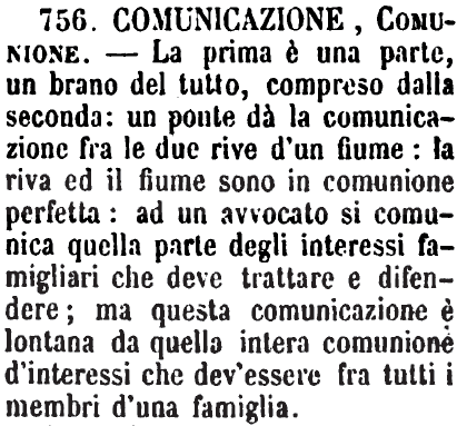 | Comunicazione, Comunione - La prima è una parte, un brano del tutto, compreso dalla seconda: un ponte dà la comunicazione fra le due rive d'un fiume: la riva ed il fiume sono in comunione perfetta: ad un avvocato si comunica quella parte degli interessi famigliari che deve trattare e difendere; ma questa comunicazione è lontana da quella intera comunione d'interessi che dev'essere fra tutti i membri d'una famiglia. [immagine] |