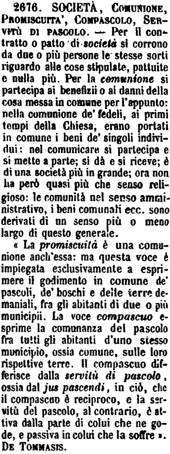 «La promiscuità è una comunione anch'essa: ma questa voce è impiegata esclusivamente a esprimere il godimento in comune de' pascoli, de' boschi e delle terre demaniali, fra gli abitanti di due o più municipii. La voce compascuo esprime la comunanza del pascolo fra tutti gli abitanti d'uno stesso municipio, ossia comune, sulle loro rispettive terre. Il compascuo differisce dalla servitù di pascolo, ossia dal jus pascendi, in ciò, che il compascuo è reciproco, e la servitù del pascolo, al contrario, è attiva dalla parte di colui che ne gode, e passiva in colui che la soffre». De Tommasis. [immagine] |