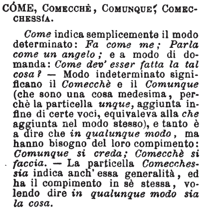 | Come, Comecchè, Comunque, Comecchesia - Come indica semplicemente il modo determinato: Fa come me; Parla come un angelo; e a modo di domanda: Come dev'esser fatta la tal cosa? - Modo indeterminato significano il Comecchè e il Comunque (che sono una cosa medesima, perchè la particella unque, aggiunta infine di certe voci, equivaleva alla che aggiunta nel modo stesso), e tanto è a dire che in qualunque modo, ma hanno bisogno del loro compimento: Comunque si creda; Comecchè si faccia. - La particella Comecchessia indica anch'essa generalità, ed ha il compimento in se stessa, volendo dire in qualunque modo sia la cosa. [immagine] |