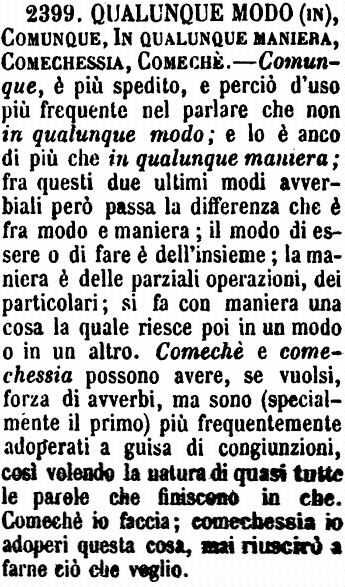 | Qualunque modo (in), Comunque, In qualunque maniera, Comechessia, Comechè - Comunque, è più spedito, e perciò d'uso più frequente nel parlare che non in qualunque modo; e lo è anco di più che in qualunque maniera; fra questi due ultimi modi avverbiali però passa la differenza che è fra modo e maniera; il modo di essere o di fare è dell'insieme; la maniera è delle parziali operazioni, dei particolari; si fa con maniera una cosa la quale riesce poi in un modo o in un altro. Comechè e comechessia possono avere, se vuolsi, forza di avverbi, ma sono (specialmente il primo) più frequentemente adoperati a guisa di congiunzioni, così volendo la natura di quasi tutte le parole che finiscono in che. Comechè io faccia; comechessia io adoperi questa cosa, mai riuscirò a farne ciò che voglio. [immagine] |