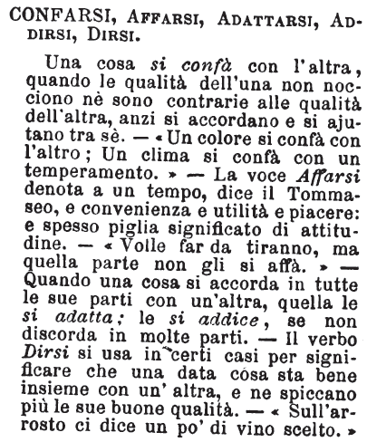 | Confarsi, Affarsi, Adattarsi, Addirsi, Dirsi - Una cosa si confà con l'altra, quando le qualità dell'una non nocciono né sono contrarie alle qualità dell'altra, anzi si accordano e si ajutano tra sè. - «Un colore si confà con l'altro; Un clima si confà con un temperamento.» - La voce Affarsi denota a un tempo, dice il Tommaseo, e convenienza e utilità e piacere: e spesso piglia significato di attitudine. - «Volle far da tiranno, ma quella parte non gli si affà.» - Quando una cosa si accorda in tutte le sue parti con un'altra, quella le si adatta; le si addice, se non discorda in molte parti. - Il verbo Dirsi si usa in certi casi per significare che una data cosa sta bene insieme con un'altra, e ne spiccano più le sue buone qualità. - «Sull'arrosto ci dice un po' di vino scelto.» [immagine] |