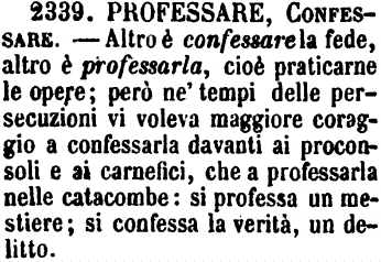 | Professare, Confessare - Altro è confessare la fede, altro è professarla, cioè praticarne le opere; però ne' tempi delle persecuzioni vi voleva maggiore coraggio a confessarla davanti ai proconsoli e ai carnefici, che a professarla nelle catacombe: si professa un mestiere; si confessa la verità, un delitto. [immagine] |