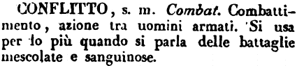 | Conflitto - s. m. Combat. Combattimento, azione tra uomini armati. Si usa per lo più quando si parla delle battaglie mescolate e sanguinose. [immagine] |